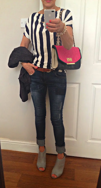 Yesterday I had an impromtu visit to Dublin and lunch out with my hubs so out came a striped top to dress up my old denim jeans! I bought this one in M&S last year as I thought the bold vertical stripes would make a change and they are supposed to make you look taller!